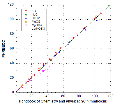 PHREEQC的计算经过与《化学与物理手册》的数据核对,该手册列出了20°C时盐溶液的SC。