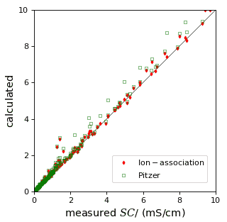 其中,\(K\)是科尔劳斯常数。我们可以使用\( \Lambda_{eq}(= \Lambda_m / |z|)) \)替\( \Lambda_m^0 \)来计算\( SC\)。或者,我们可以坚持使用\( \Lambda_m^0 \),但用电化学活性系数校正摩尔浓度。